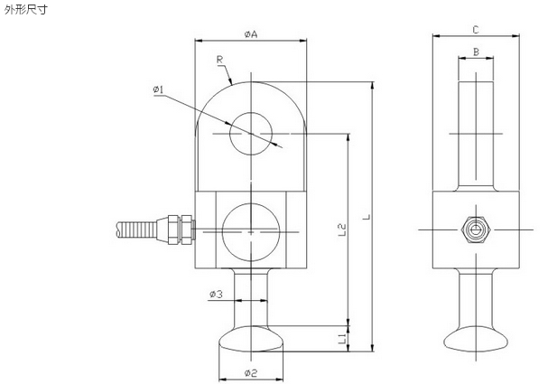 傳感器采用柱式結(jié)構(gòu),測量精度高、抗偏載能力強;將傳感器連接端做成球頭掛環(huán)樣式,取代傳統(tǒng)球頭掛環(huán);安裝在絕緣子串與衡量之間,測量導(dǎo)線的載荷力。