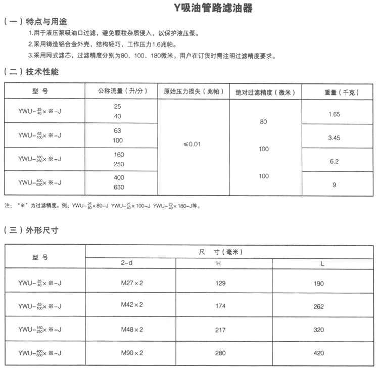 YWU-25*80-J,YWU-40*80-J,YWU-63*100-J,YWU-100*100-J,YWU-250*80-J,Y型油管路濾油器 |