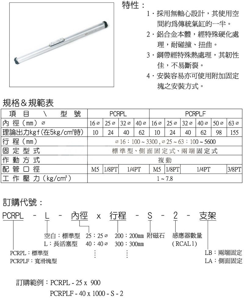 PCRPL-16,PCRPL-25,PCRPL-32,PCRPLF-16,PCRPLF-25,panix鋼帶式無(wú)桿氣缸