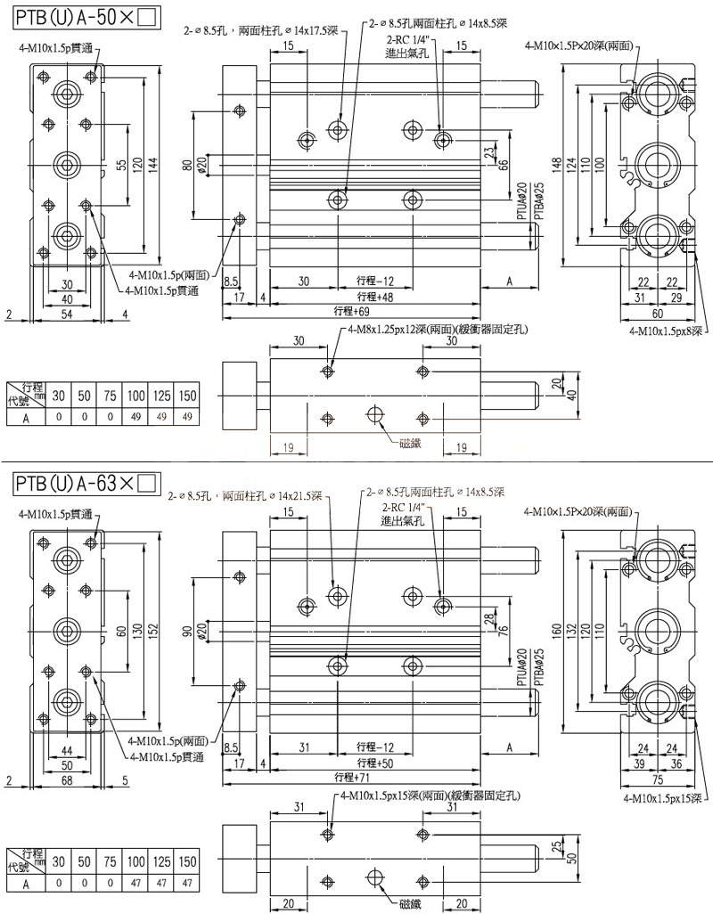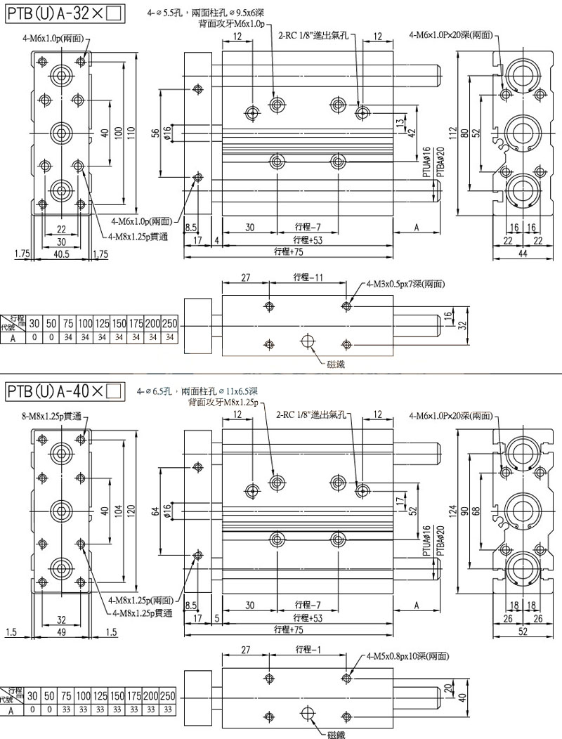 PTBA-10,PTBA-20,PTBA-32,PTBA-40,PTUA-10,PTUA-20,PTUA-32,panix導桿薄型氣缸