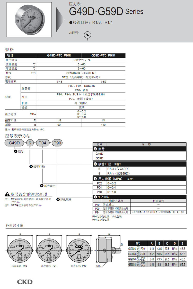 G49D-6-P02-P70,G49D-8-P02-P70,G49D-6-P04-P70,G49D-8-P04-P70,G49D-6-P10-P70,CKD壓力表