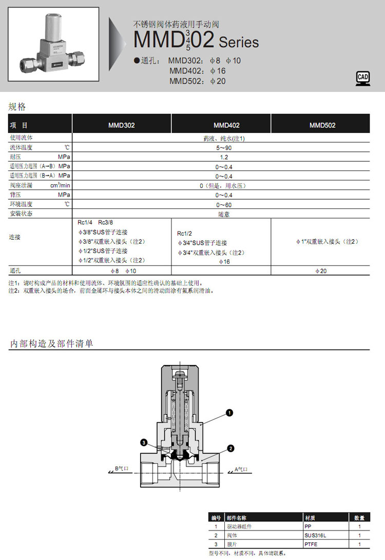MMD302-8,MMD402-15,MMD502-8BT,MMD302-3BT,MMD302-6S,MMD402-12S,MMD502-16S,CKD藥液用手動(dòng)閥