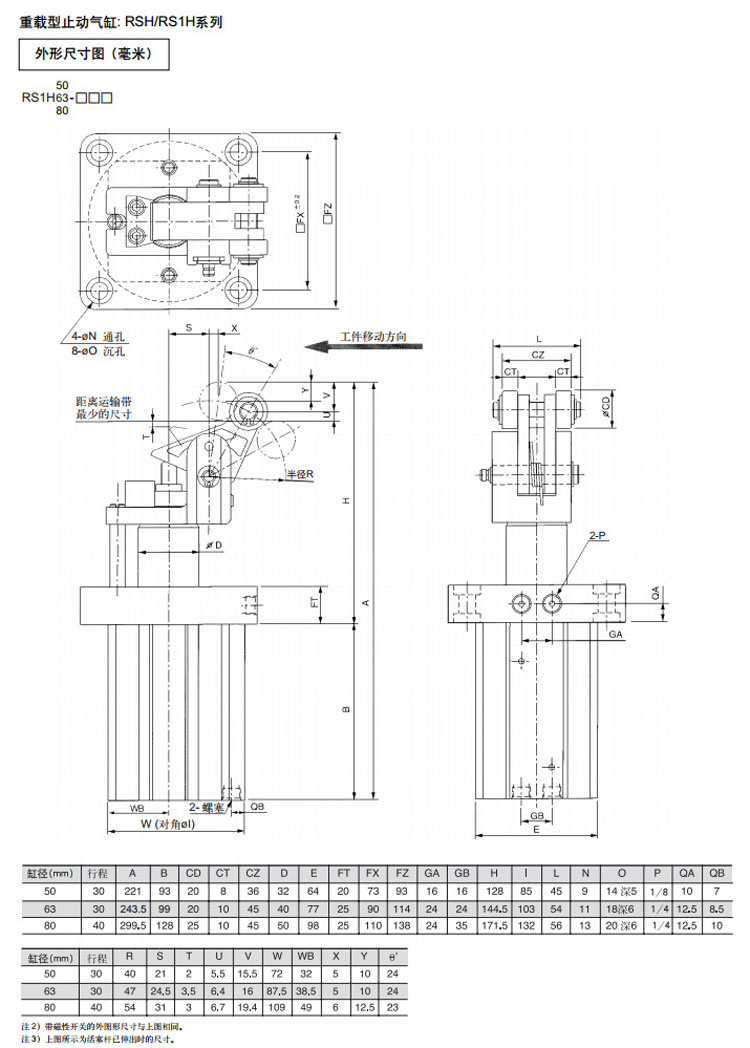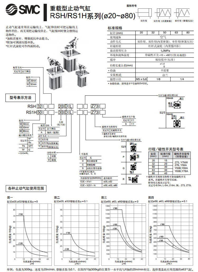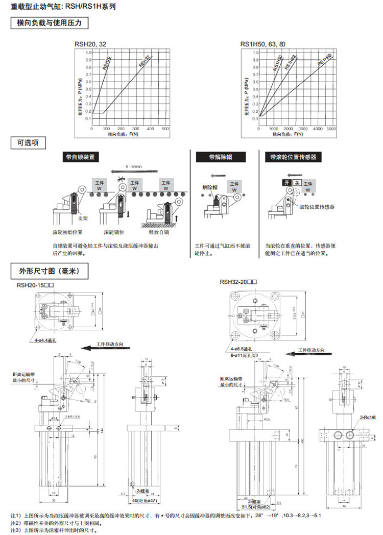 RSH20-15D,RSH20-15B,RSH20-15T,RSH32-20D,RS1H50-30D,RS1H63-30D,RS1H80-40D,SMC重載型止動(dòng)氣缸