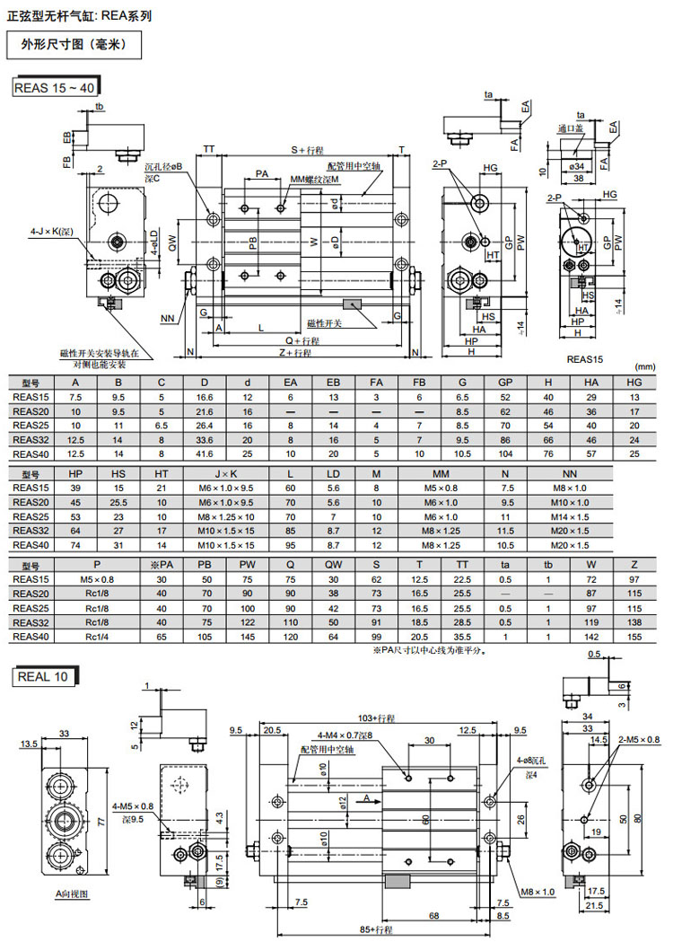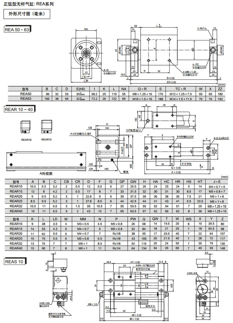 REAR10-150,REAR15-150,REAR20-200,REAR25-200,REAR32-200,REAR40-200,REAR10-200,SMC正弦無(wú)桿氣缸