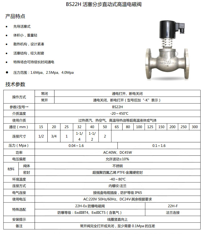BS22H-DN15,BS22H-DN20,BS22H-DN25,BS22H-DN32,活塞分步直動(dòng)式高溫電磁閥