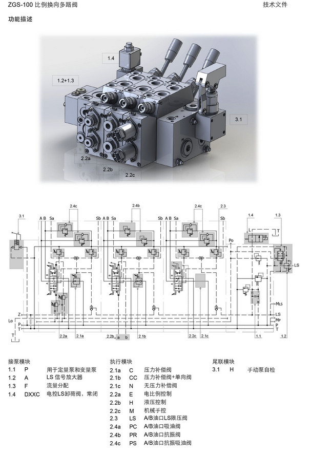 ZGS-100是帶壓力補償?shù)呢撦d敏感比例換向多路閥。它的流量控制同負載壓力無關,也是說,某個執(zhí)行模塊所需要的流量與該執(zhí)行模塊的負載壓力無關,同時,這個執(zhí)行模塊所需要的流量同其它執(zhí)行模塊的負載壓力及流量也無關。這樣,當幾個動作,幾個執(zhí)行模塊同時工作的時候,各個動作可以按照各自的速度壓力進行工作,相互獨立,互不影響。以上情況的前提條件是:各個動作所需要的總流量小于泵可以提供的總流量。ZGS-100整體采用統(tǒng)的模塊化設計,用戶可以根據(jù)功能要求對閥體進行不同的組合,簡單可靠。