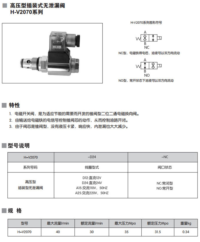 H-V2070-D24-NO,H-V2070-A25-NO,H-V2070-D12-NC,H-V2070-D12-NO,H-V2070-A15-NC,高壓型插裝式無(wú)泄漏閥