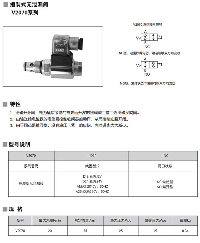 V2070-D24-NC,V2070-D24-NO,V2070-D12-NC,V2070-D12-NO,V2070-A15-NC,V2070-A15-NO,插裝式無泄漏閥