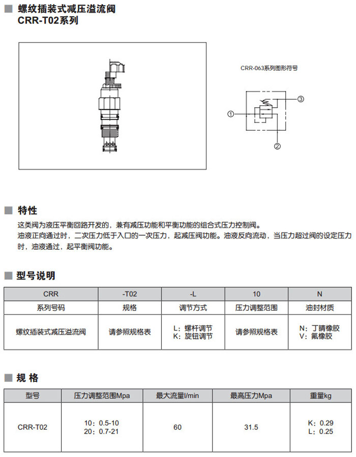 CRR-T02-L10N,CRR-T02-L20N,CRR-T02-L10V,CRR-T02-L20V,CRR-T02-K10N,CRR-T02-K20N,螺紋插裝式減壓溢流閥