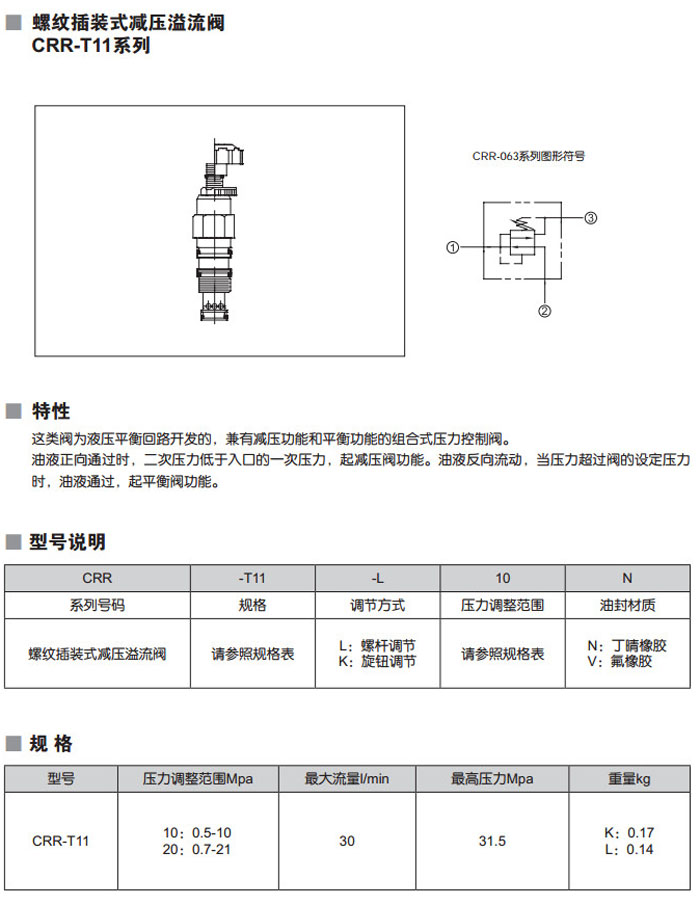 CRR-T11-L10N,CRR-T11-L20N,CRR-T11-L10V,CRR-T11-L20V,CRR-T11-K10N,CRR-T11-K20N,螺紋插裝式減壓溢流閥