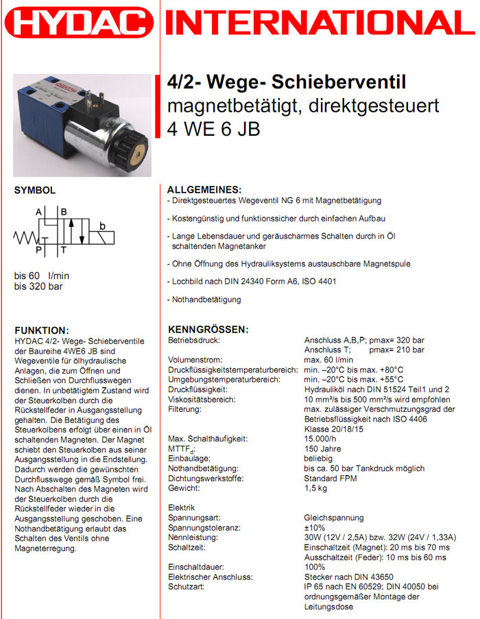 4WE6JBS01-12DG/V,4WE6JBS01-24DG/V,HYDAC電磁4/2方向滑閥