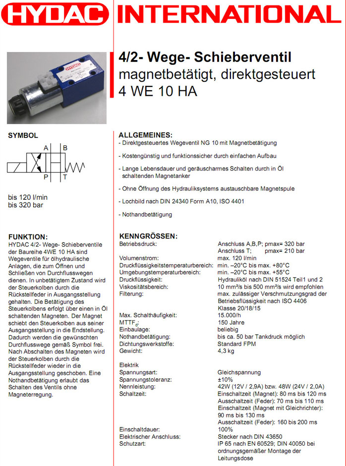 4WE10HAS01-12DG/V,4WE10HAS01-24DG/V,HYDAC電磁4/2方向滑閥
